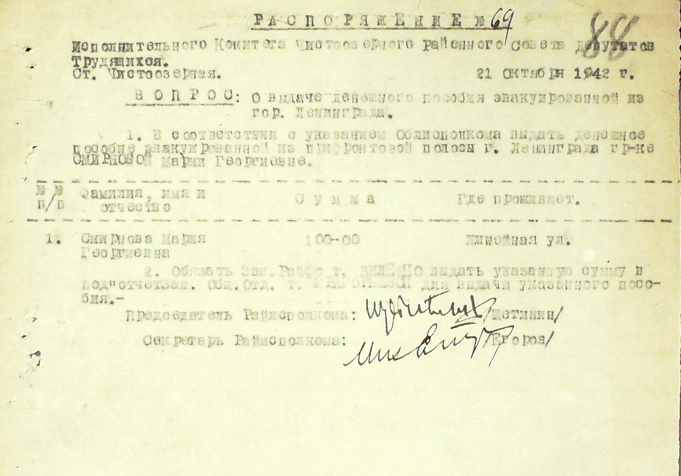 Распоряжение Исполнительного Комитета Чистоозерного районного Совета депутатов трудящихся "О выдаче денежного пособия эвакуированной из гор. Ленинграда"
