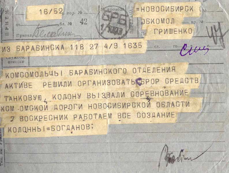 Главная / «Всё для фронта, всё для победы!» / Шефская помощь сибиряков / Сбор денежных средств фонд обороны страны